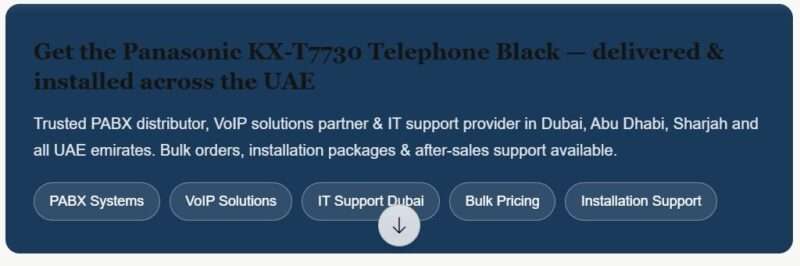 Businesses in Abu Dhabi, Dubai, Sharjah, Ajman, Umm Al Quwain, Ras Al Khaimah, and Fujairah rely on the Panasonic KX-T7730 Telephone Black for daily operations. Its stable performance helps reduce downtime and improve productivity.